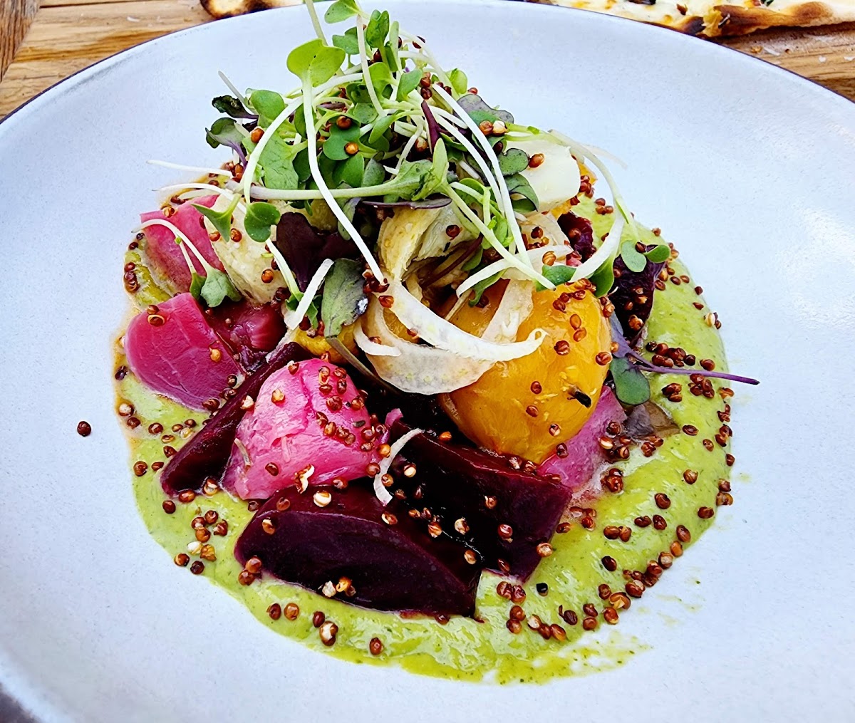 Good dining experience. The chefs are very skillful. Every dish is cooked to perfection and I enjoyed every bite. Ingredients are directly sourced from local farms. Very fresh. Dinner service is great (but breakfast basically has no service). Cute interior design (great for family / friend gathering). Now, couple negatives : first, portion size of the dinner items is small for its price. Second, HealthySF” 8% fee is a surprise. It’s not a government mandate. It’s just a label put on there to raise profit. It would be better to just raise the price of each item by 8% instead of charging a fee as it makes pricing confusing and seemingly deceiving. Second issue is that large espresso drinks don’t come with a ceramic cup but that it must be served in a paper cup. 1 Hotel is emphasized on being green. This practice doesn’t go along with 1 Hotel’s ideology. That said, overall, still a very great restaurant and we enjoyed both meals !