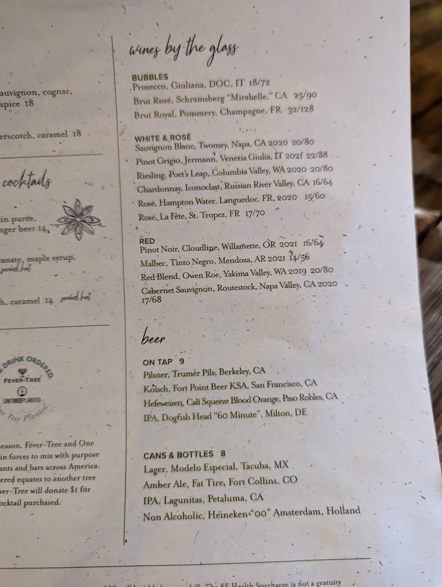 Guests can expect a range of options including hearty plates like the N'Duja Flatbread and Marinated Steak Skewers, bright and fresh salads such as the Beet Salad, as well as approachable snacks like Za’atar Fries and Vegan Sliders. The beverage list complements the food with carefully chosen wines, cocktails, and organic sodas, helping to create a welcoming atmosphere that encourages slow, easy enjoyment.